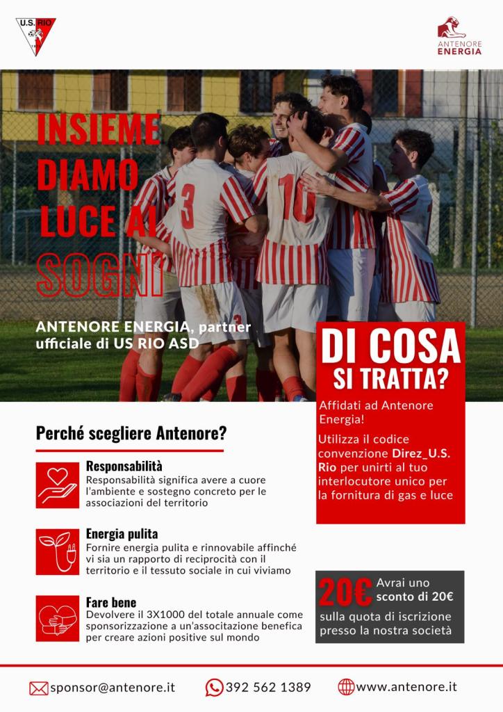 Per sposare questo progetto “INSIEME DIAMO LUCE AI SOGNI” e dare una mano, è possibile affidarsi ad Antenore Energia perché anche un piccolo cambio per voi possa rappresentare un grande vantaggio per ognuno di noi. In relazione a questo progetto, è possibile visitare il sito e, utilizzando il codice Direz_U.S. Rio, entrerete in una grande community, in cui è d’ordine avere a cuore l’Ambiente. Fatto ciò sarà possibile avere, di conseguenza, uno sconto di 20euro sulla quota d’iscrizione presso la nostra società sportiva.